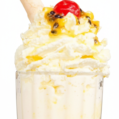 Combinación de helado o yogur de maracuyá, salsa artesanal de maracuyá, cereza, chantilly y barquillo.