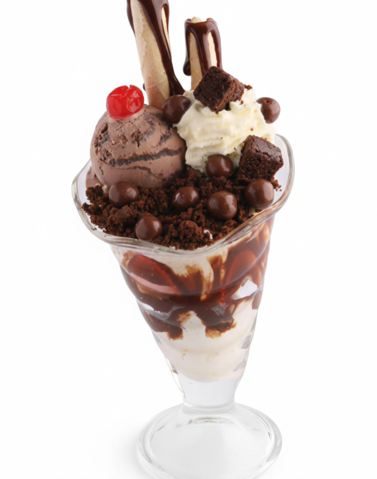 2 Sabores de helado, brownie, Chokys, crema chantilly, fresa, cereza y salsa de chocolate.