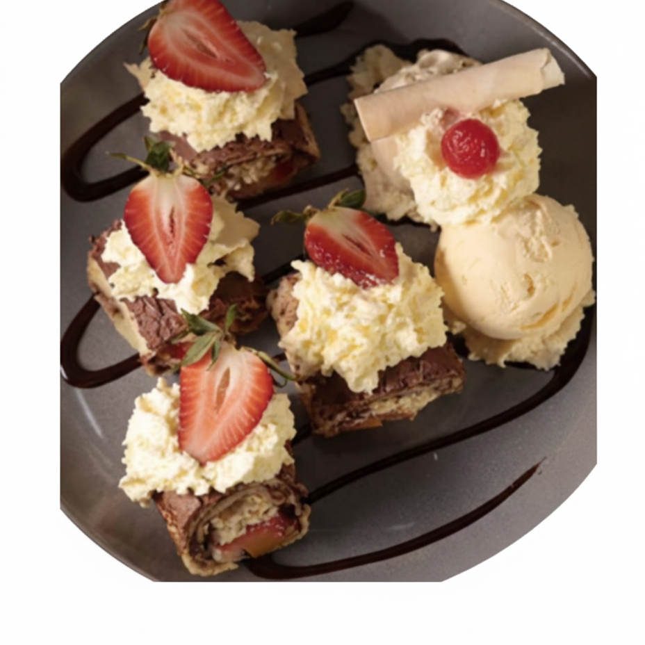 Divertidos rollitos rellenos de queso, frutas y chocolate Cordillera, con 2 sabores de helado y crema chantilly.