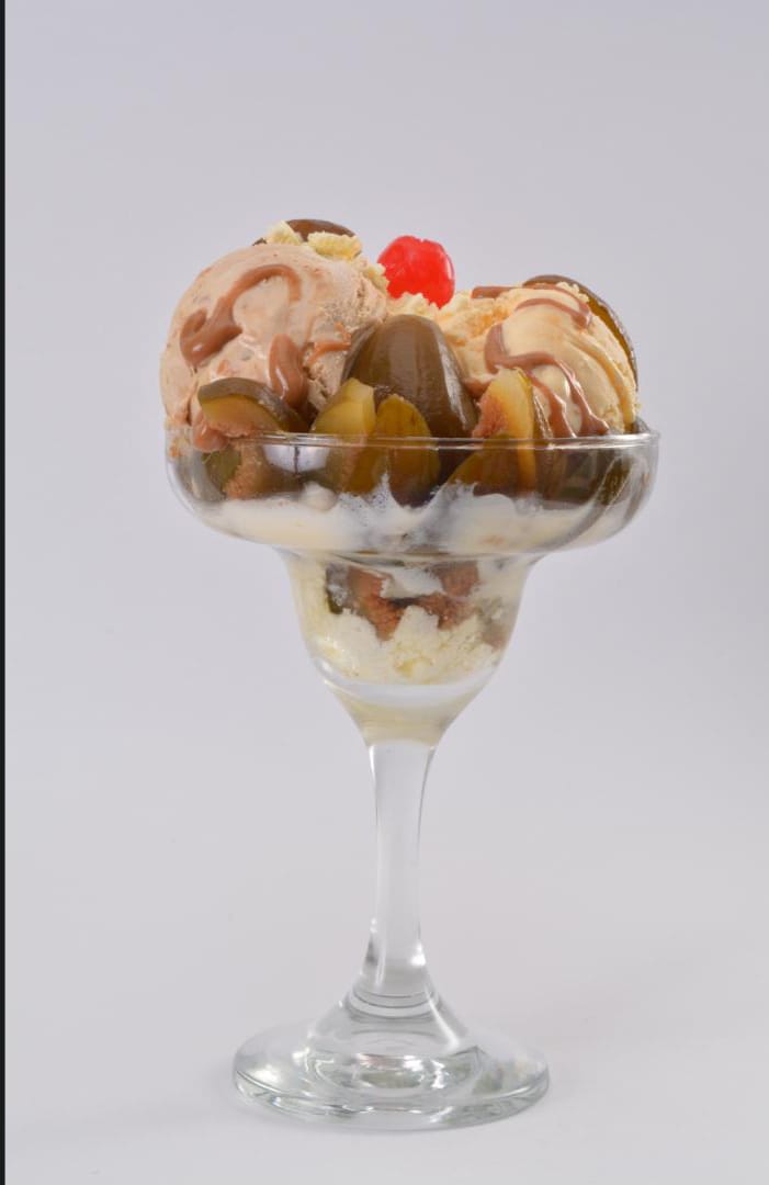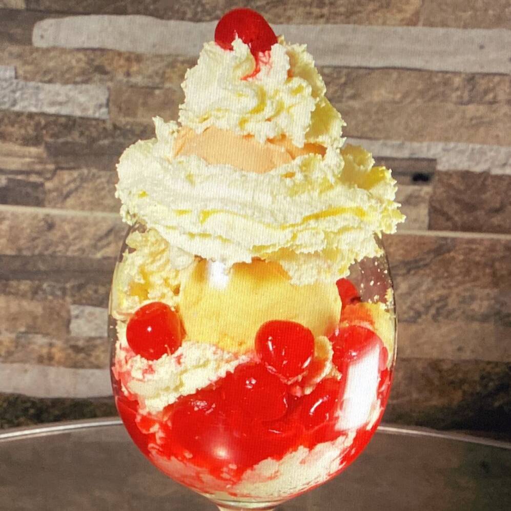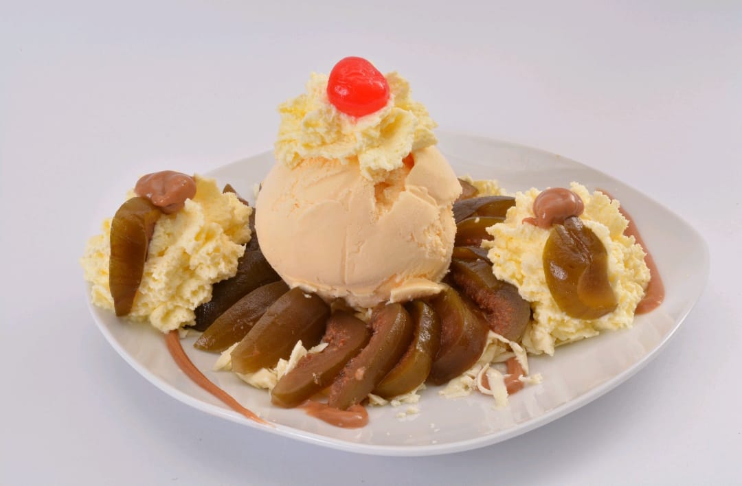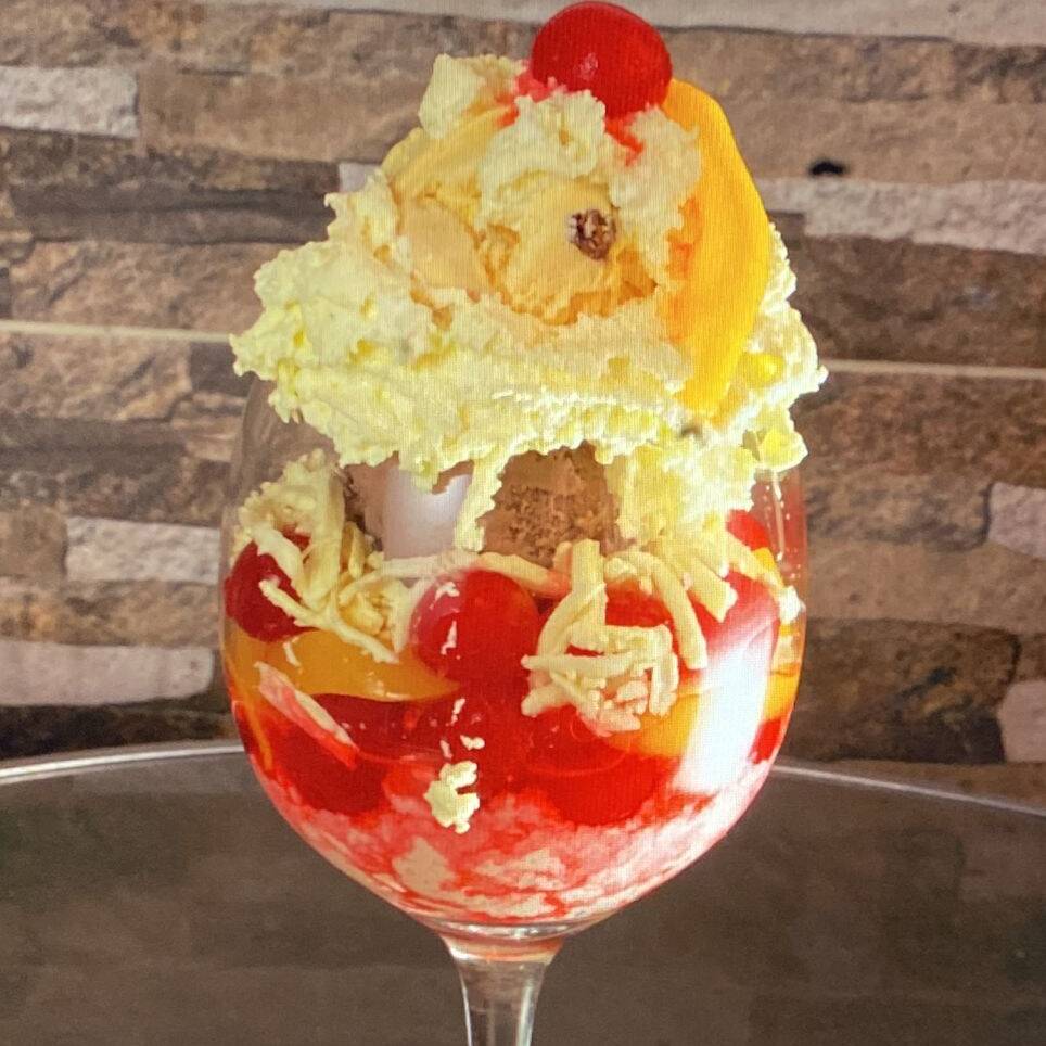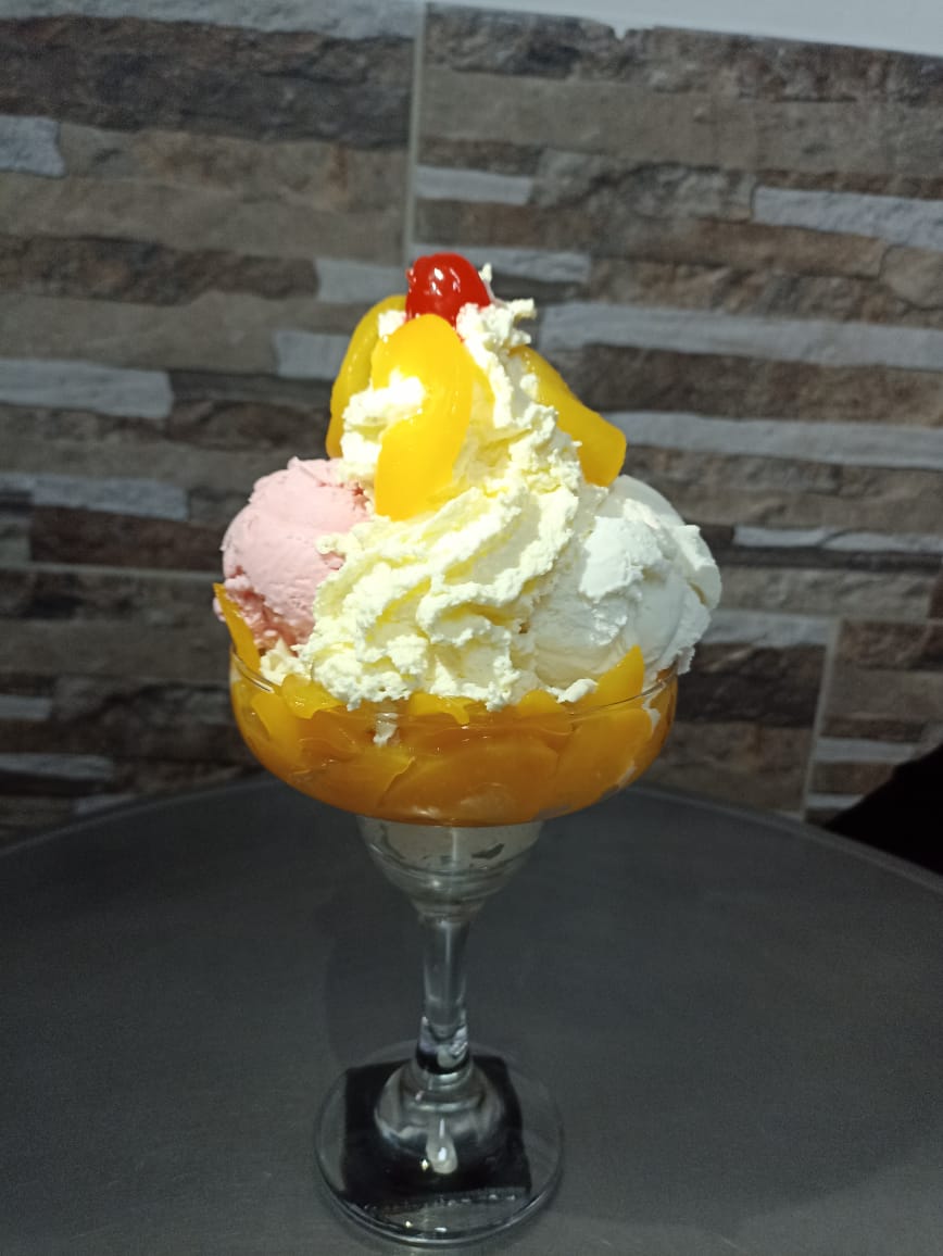 Combinación Ideal de 2 sabores de helado ron con pasas y frutos rojos, con suaves duraznos en almíbar, cerezas, queso. Decorada con suave crema chantillí.