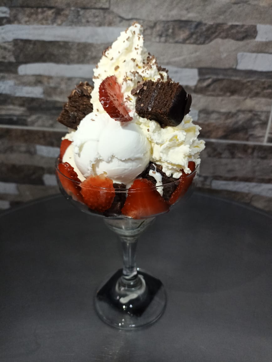 Combinación de brownie, fresas, leche condensada, Helado ron con pasa y crema chantillí.