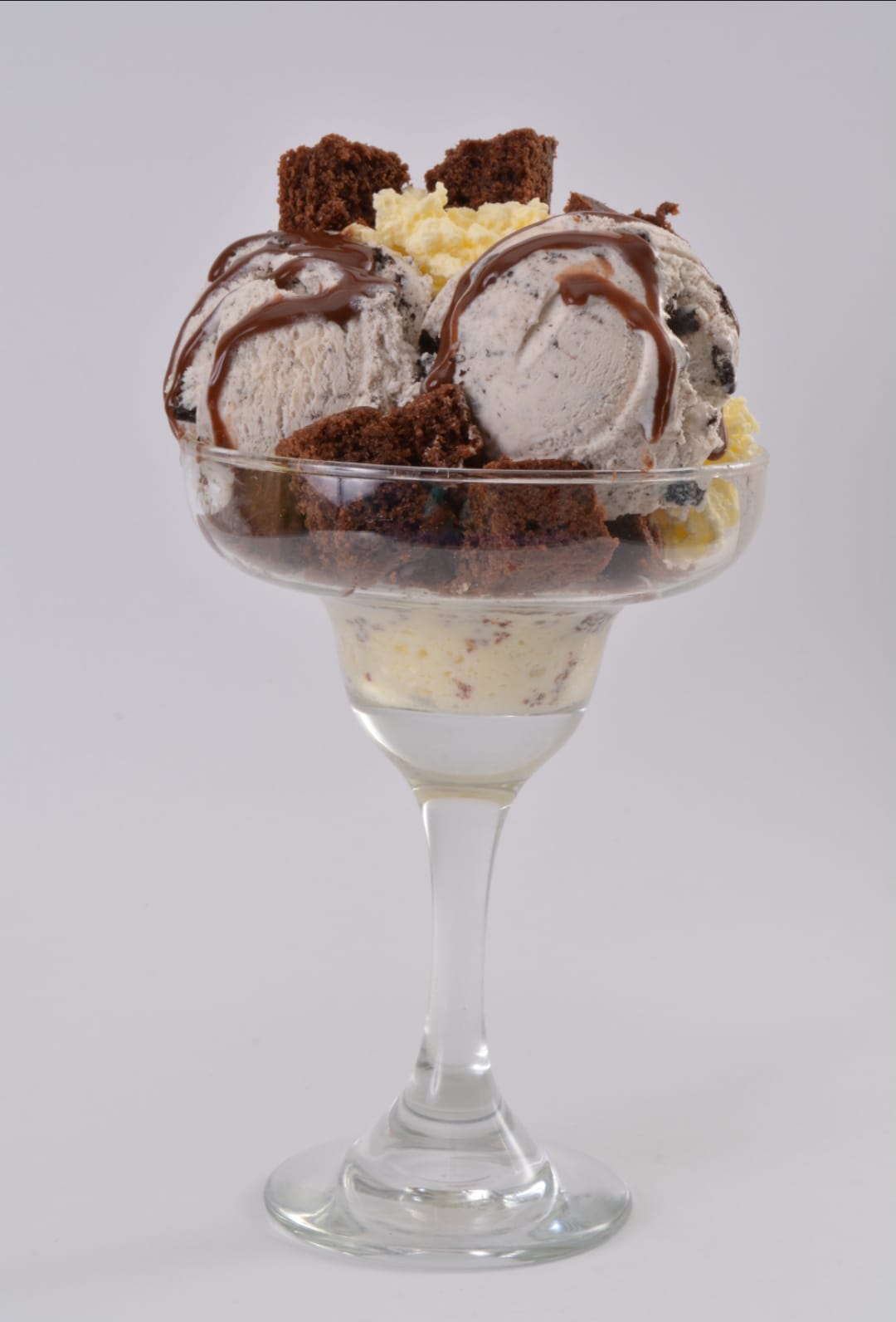 Delicado Brownie con un delicioso Sabor de Helado, Chips De Chocolate , Suave Crema de Chantilly y Salsa De Chocolate Hersheys.