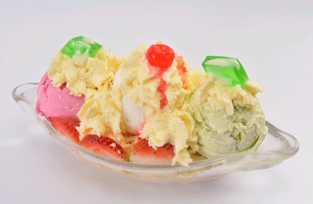 Fresco Banano con la combinacon ideal de 3 Sabores de Helado, Queso,Fresas, Crema De Yogurth , Decorada con gelatina y Suave Crema Chantilly.