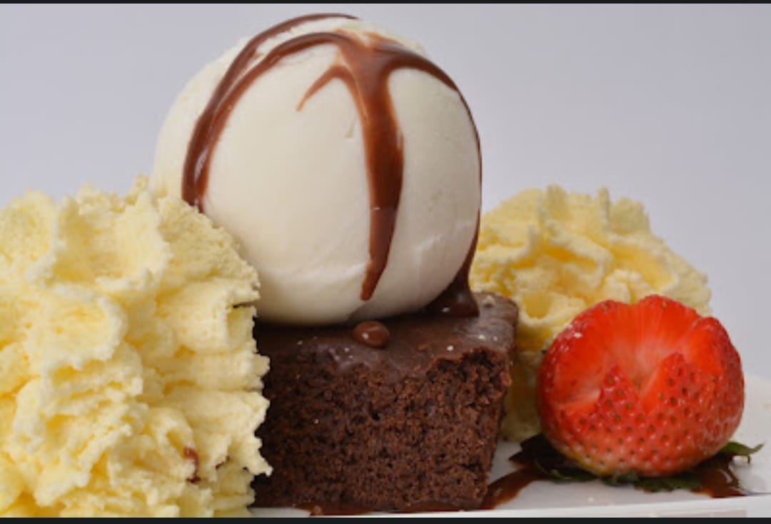 Tentador brownie con crema de yogurt, 2 sabores de helado maracuyá y limón y suave crema chantillí.