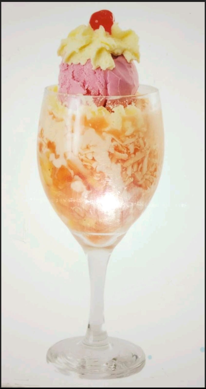 Fresca mezcla de frutas (mango, manzana roja, durazno, pera, fresas y cerezas). Acompañado de 2 sabores de helado arequipe y uva, gelatina, queso, crema de yogurt. Decorado con suave crema chantillí.