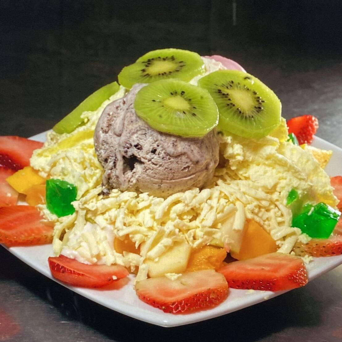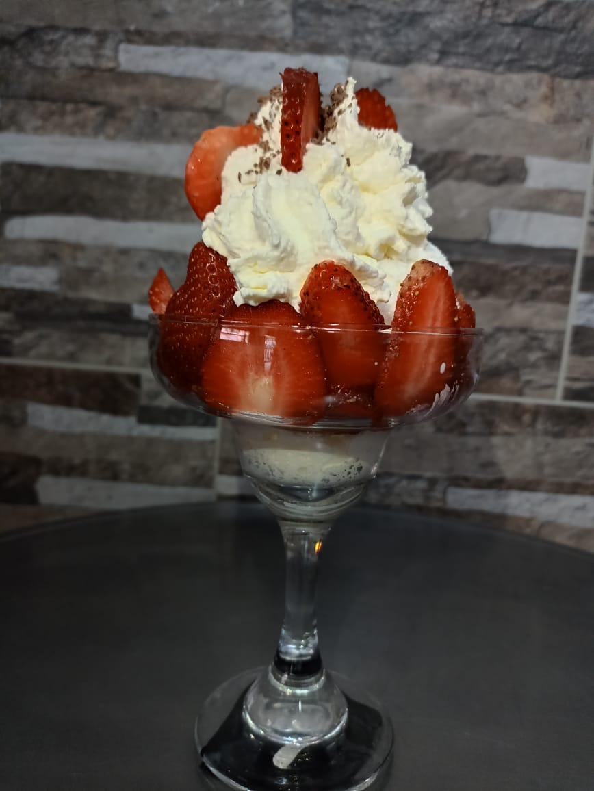 Saludable mezcla frutal (kiwi, mango, manzana verde, pera y fresa). Acompañado de 2 sabores de helado frutos rojos y fresa, gelatina, queso, crema de yogurt. Decorado con suave crema chantillí.