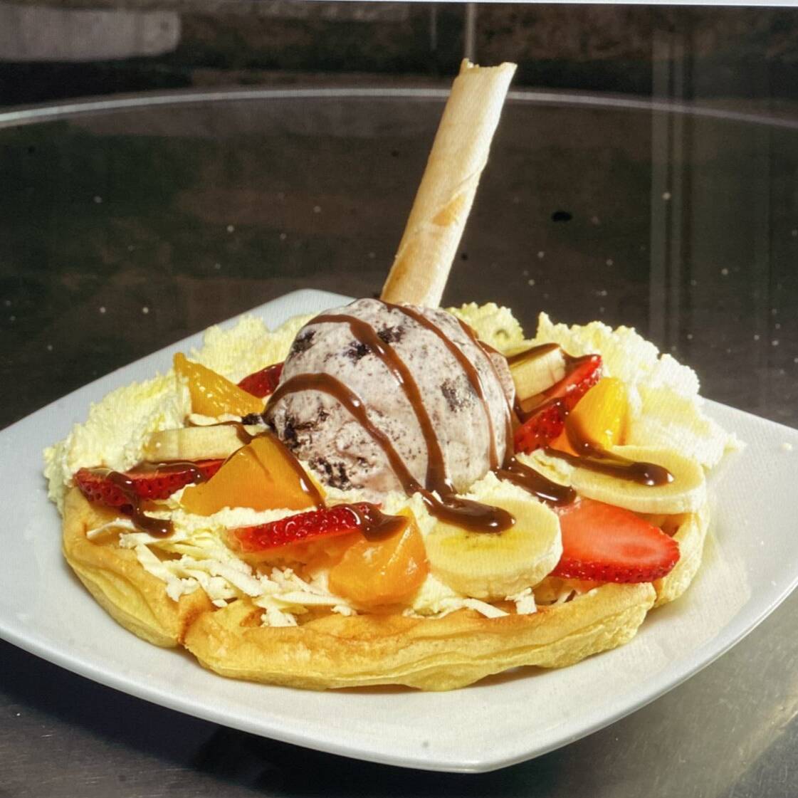 Deliciosa Mezcla de Helado(SABOR A PREFERENCIA), Decorada con suave crema Chantilly , salsas , acompañada de un crujiente Barquillo.