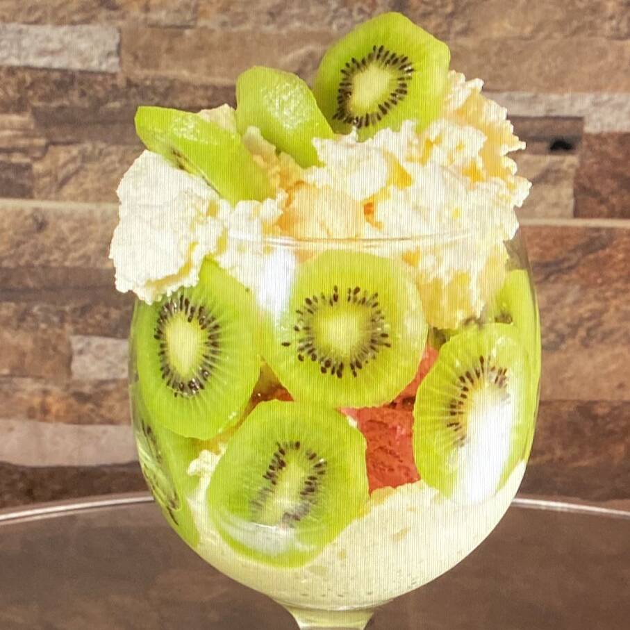 Deliciosa combinación de kiwi con 2 sabores de helado pistacho y chicle, queso, suave crema de chantillí. Decorado con crujiente barquillo.