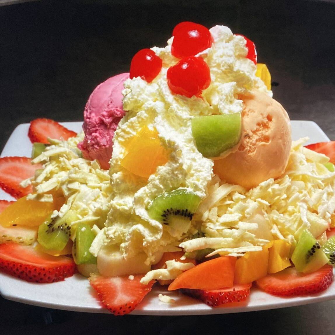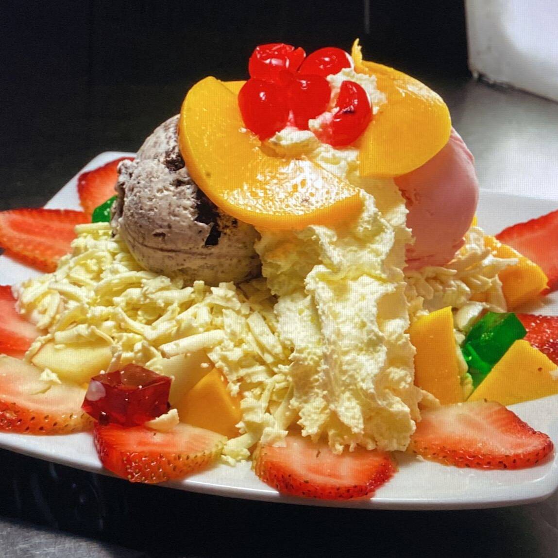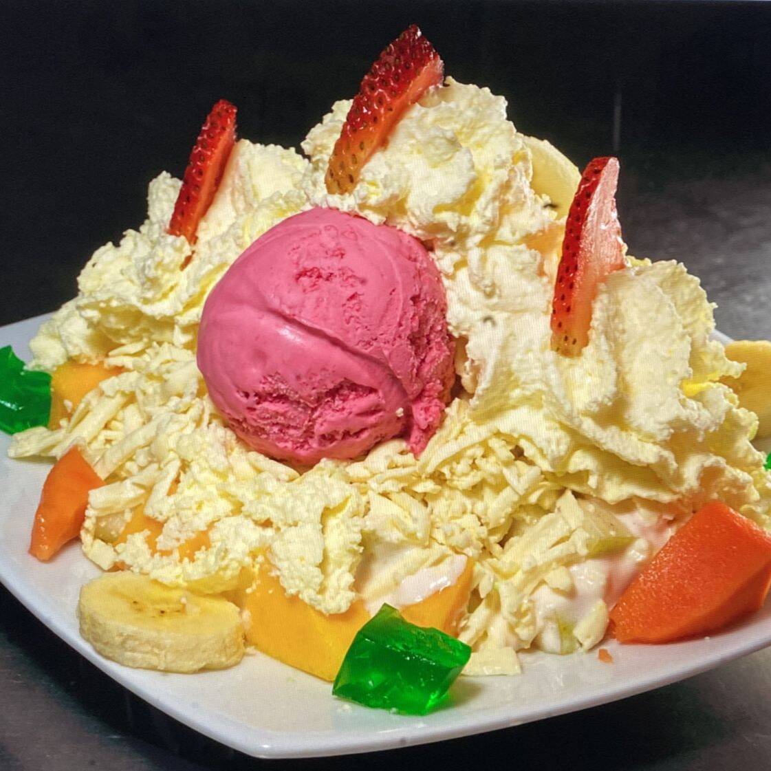 Fresca mezcla de frutas (papaya, banano, mango, manzana roja, fresa). Acompañado de 2 sabores de helado arequipe y chocolate, gelatina, queso, crema de yogurt. Decorado con suave crema chantillí.