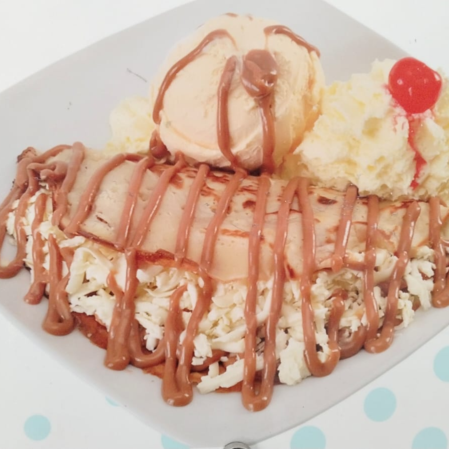 Suave tortilla acompañada con un delicioso sabor de helado, arequipe Colanta, queso, decorado con suave crema chantillí y cereza.