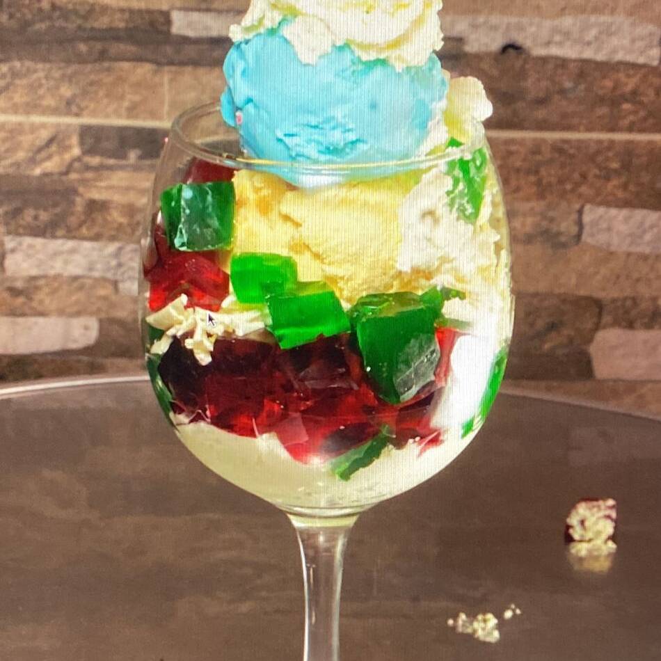 Divertida combinación de 2 sabores de helado de vainilla y chocolate con deliciosos trozos de gelatina, queso, leche condesada y suave crema de chantillí.