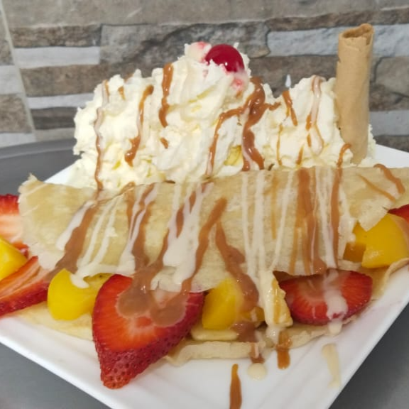 Suave tortilla acompañada con un delicioso sabor de helado, fruta fresca (durazno, banano y fresa). Queso y deliciosa crema de chantillí.