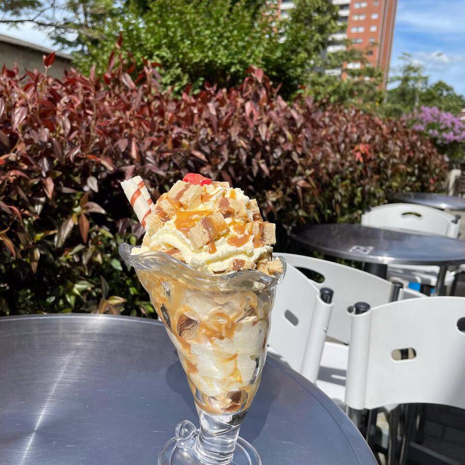 2 Bolas de helado del día, banano fresco, barquillos, fresa, abundante crema chantilly, maní o lluvia de chocolate, salsa de tu preferencia. Platillo personal