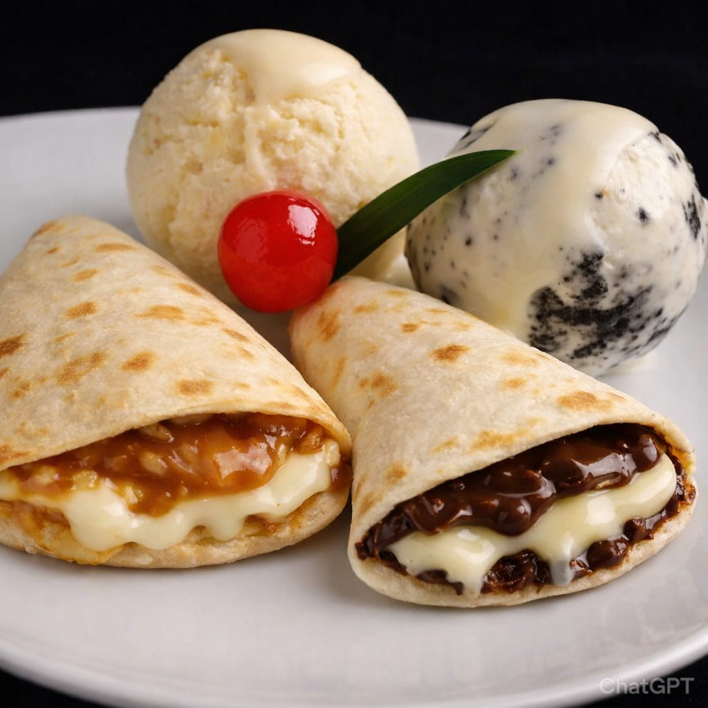 Quesadilla Dulce con Helado (Tres sabores) Tortilla de harina rellena con queso mozzarella fundido y suave arequipe y chocolate semiamargo. Servida con dos bolas de helado artesanal a tu elección. Un postre gourmet con el equilibrio perfecto entre lo cremoso, dulce y salado.