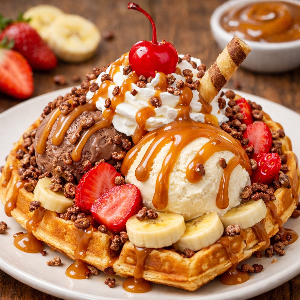 El waffle más completo esta aquí...waffle doradito con fresas y banano, helado (Tres sabores), nube de chantilly, barquillo piazza y lluvia de chococrispis.