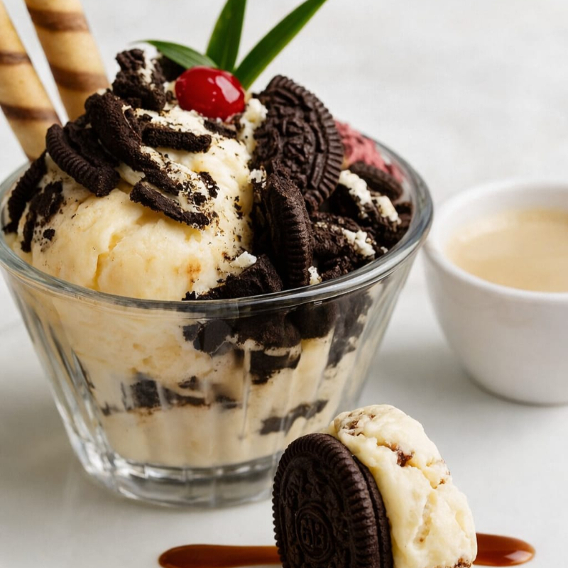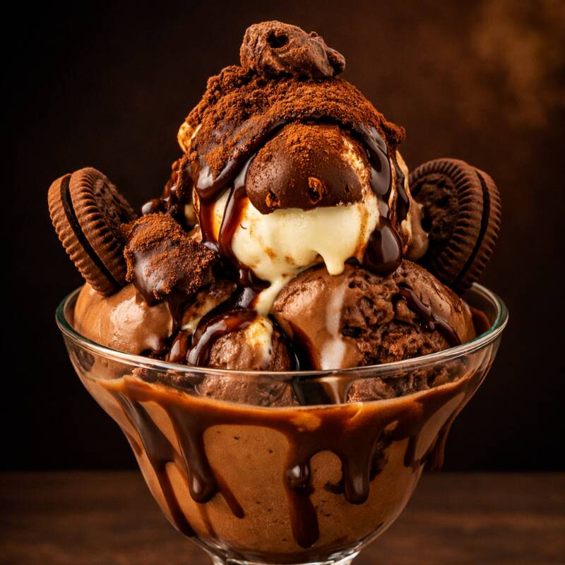 Helado cremoso (tres bolas) con trozos de galleta Oreo, bañado con una deliciosa salsa de café al licor que realza su sabor. Una experiencia intensa y dulce.