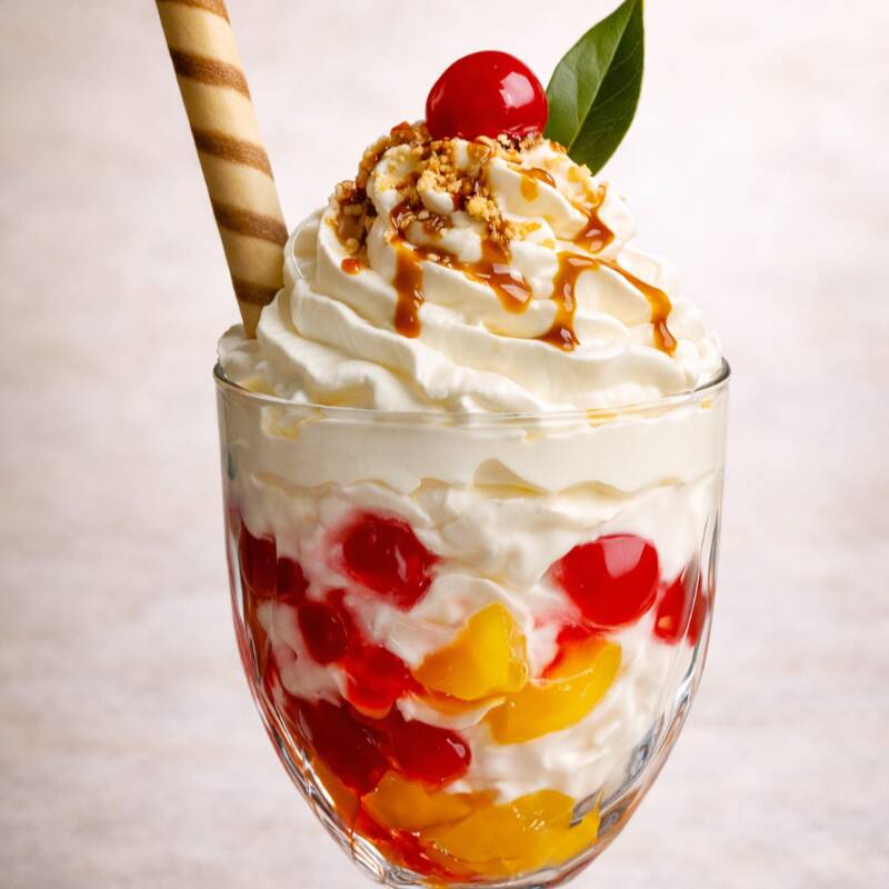Jugosos duraznos en almíbar acompañados de cremoso helado (Tres sabores), crema Chantilly suave y cerezas dulces. Un postre clásico, delicado y lleno de sabor que conquista corazones .