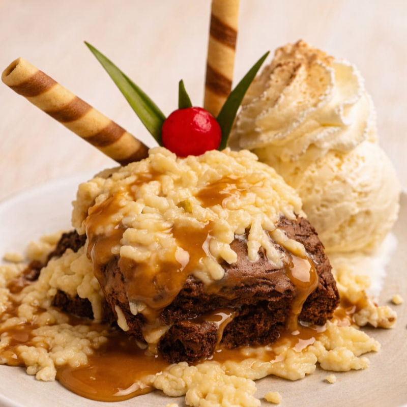 Brownie acompañado de una porción de queso, tu helado favorito (Tres sabores), Chantilly, barquillos crocantes y una cereza en la cima. ¡Una combinación única y deliciosa!