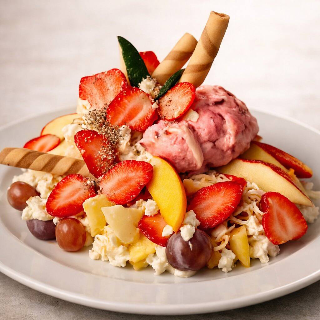 Una mezcla fresca y colorida de banano, mango, piña, manzana, papaya y fresas, acompañada de cremoso helado artesanal (Tres sabores), queso rallado y un toque suave de crema Chantilly. Una combinación perfecta entre lo saludable y lo delicioso, ideal para refrescarte en cualquier momento.(24onz)
