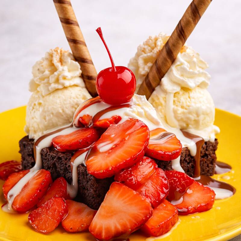 Brownie artesanal de chocolate intenso con fresas frescas, helado cremoso a elección(Tres sabores), crema Chantilly y decoración especial que lo hace tan hermoso como irresistible. ¡Un postre que enamora a primera vista y conquista al primer bocado!