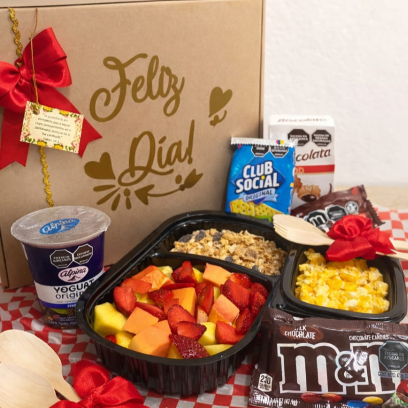 Cajita especialmente decorada para sorprender: Fruta fresca variada, Porción de granola crocante, Yogurt, Huevos revueltos con maicitos, Chocolates finos M&M, Galletas Club Social, Galletas chocolatadas Biscolata, Tarjeta de tips para disfrutarlo al máximo.