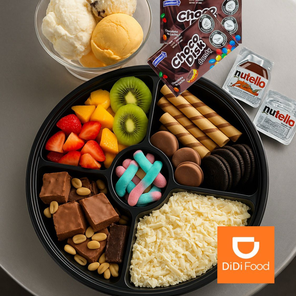 La combinación perfecta para compartir en familia, incluye fresas, kiwi, mango, súper porción de queso de 150 g, 4 mini brownies, maní, 6 barquillos Piazza, 4 galletas Oreo, 8 Chocomelos, 15 gomitas, 2 Chocodisk, 2 nutella, helado 4 bolas de tu sabor favorito.