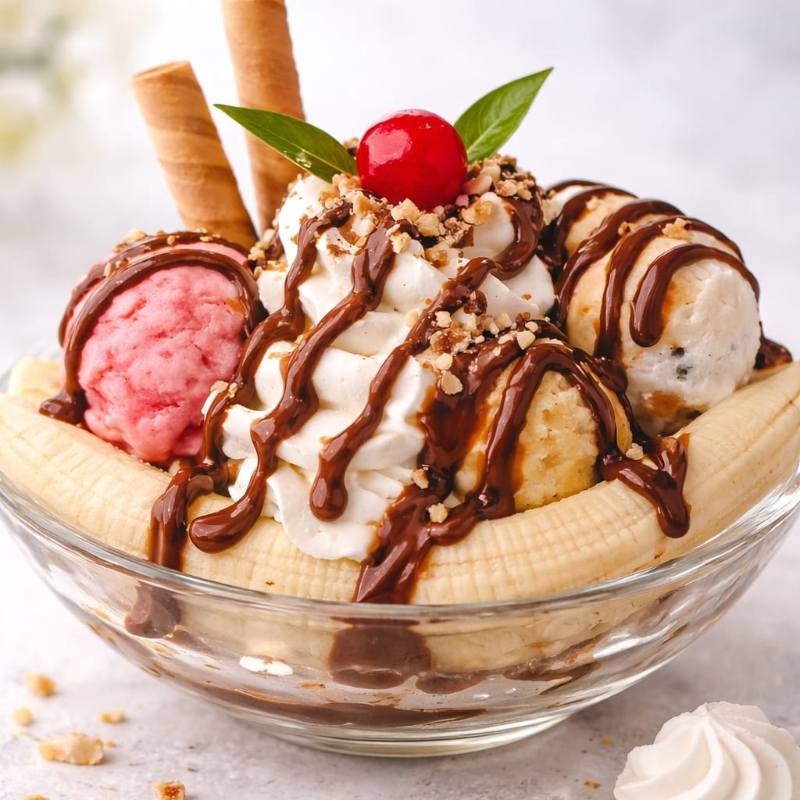 Una explosión de sabor con banano fresco, helado a elección (Tres sabores), queso rallado, crema Chantilly, barquillo crocante, cereza y un toque irresistible de salsa de chocolate. ¡Un clásico que nunca falla y siempre antoja!