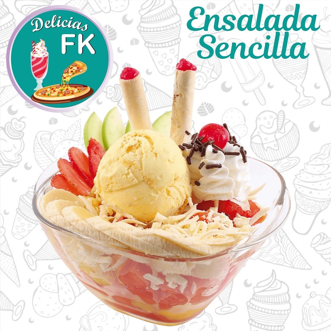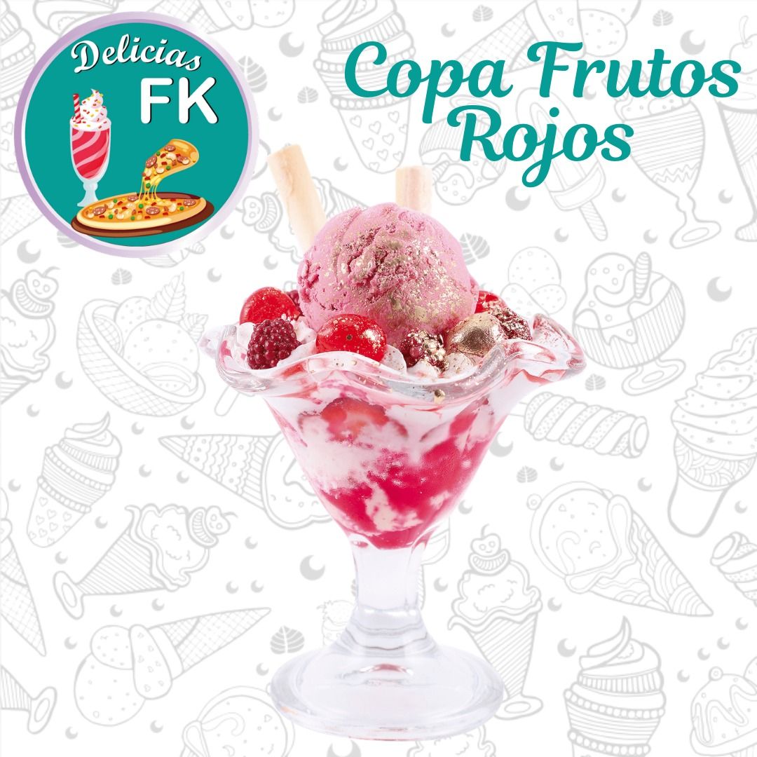 Variedad de frutas acompañadas de un sabor de helado, queso, crema de chantillí, cereza, crema de leche, salsa de tu elección y barquillos.