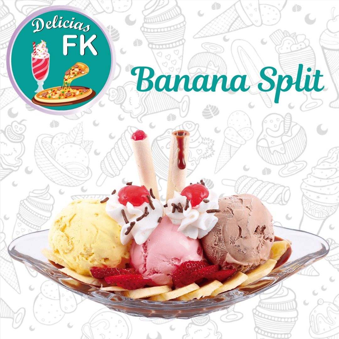 Tres sabores de helado , banano, fresa, chantillí, salsa de tu elección, lluvia de chocolate y fresas.