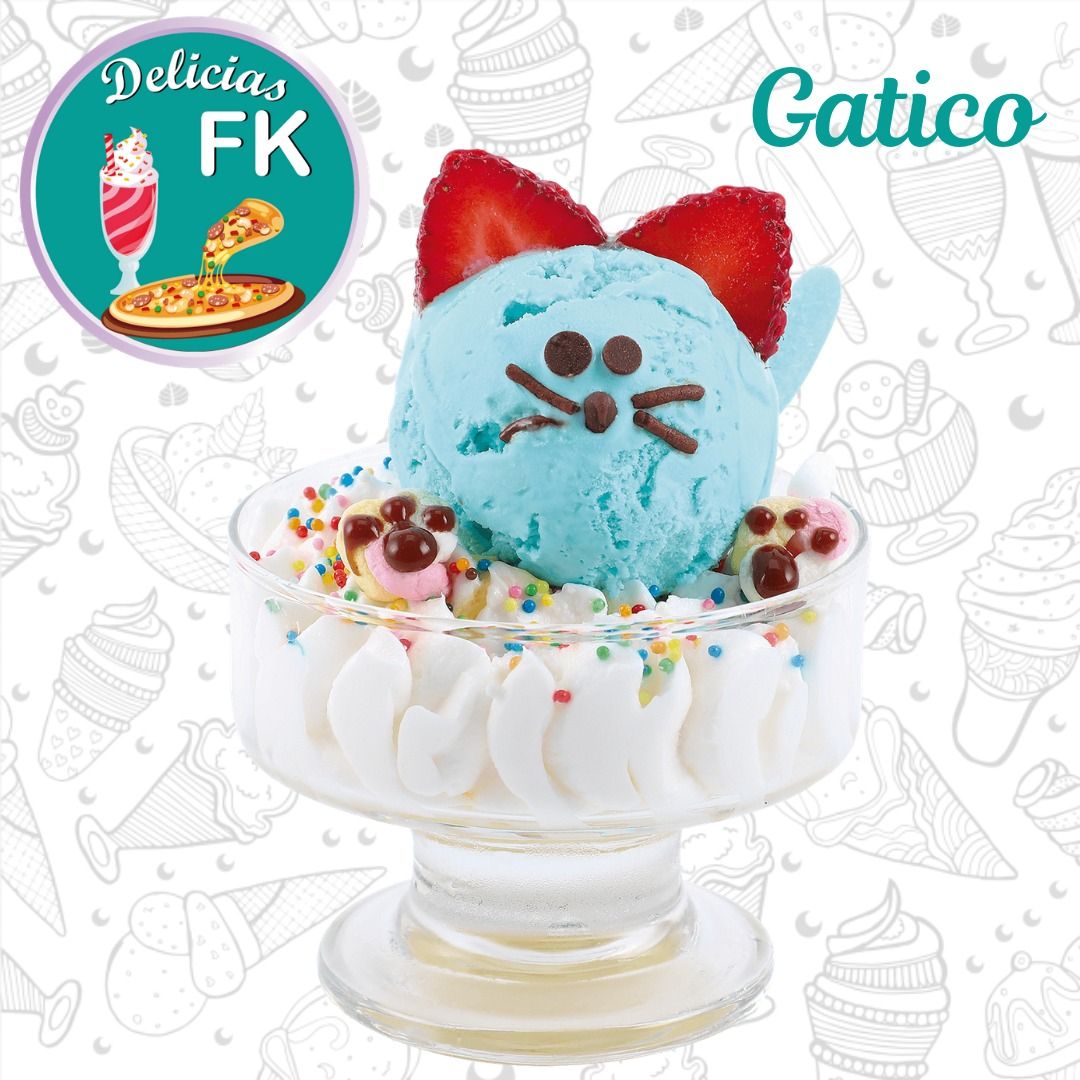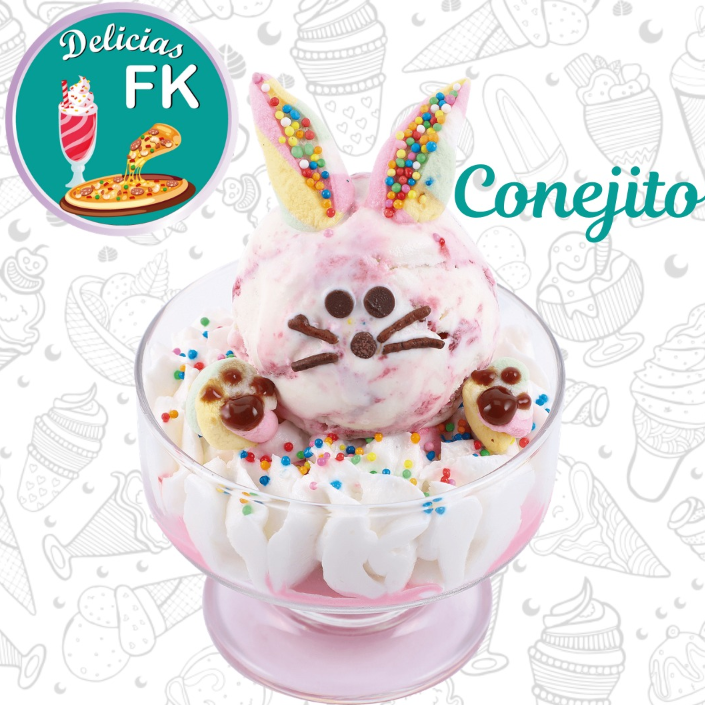 Un sabor de helado, chantilli, bolitas de colores, orejitas y patitas de masmelo, chips de chocolate y lluvia de chocolate.