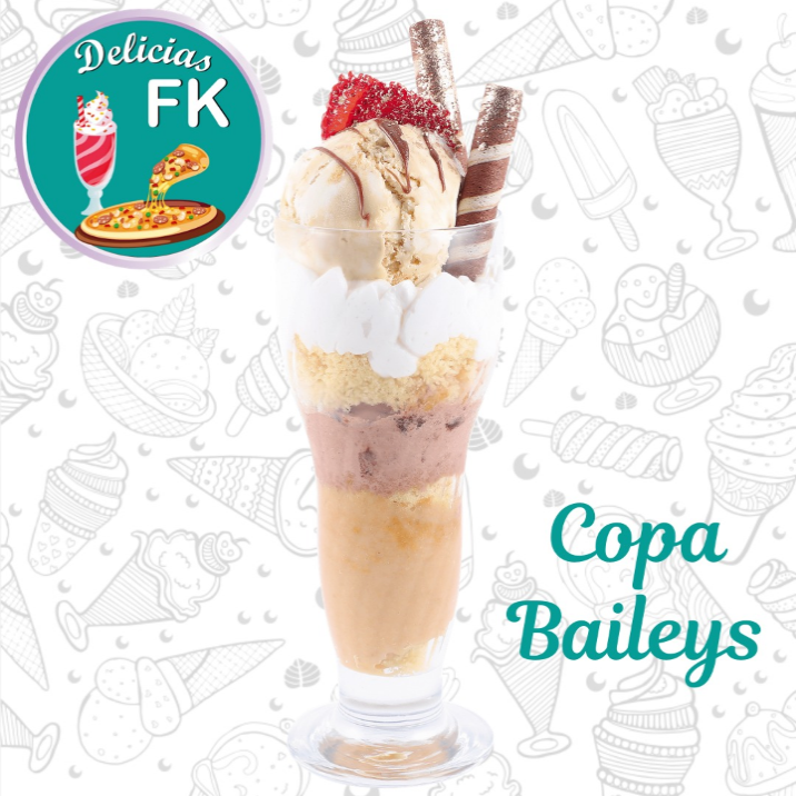 Dos sabores de helado acompañados con ponqué, remojados en baileys, chantillí, barquillo, fresas y la salsa de tu elección.