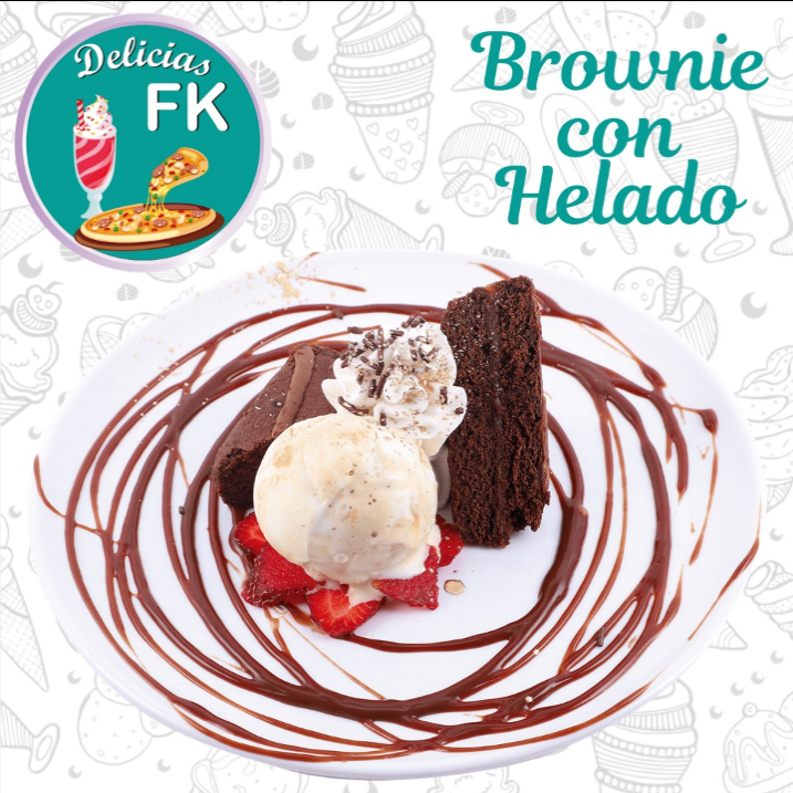 Brownie frio o caliente, un sabor de helado, chantillí, salsa de tu elección, lluvia de chocolate y fresas.
