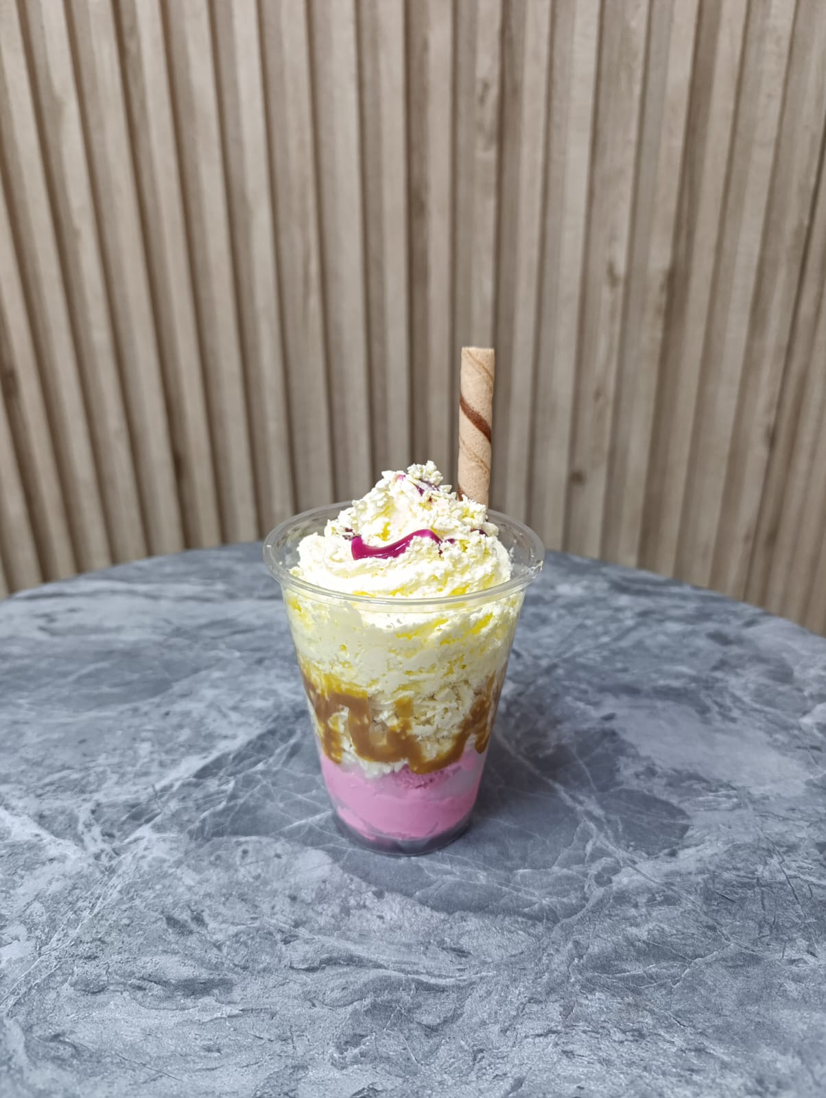Una porción de helado, chantilly, crema de leche, lechera, crispy blanco, barquillos. Vaso 12Oz