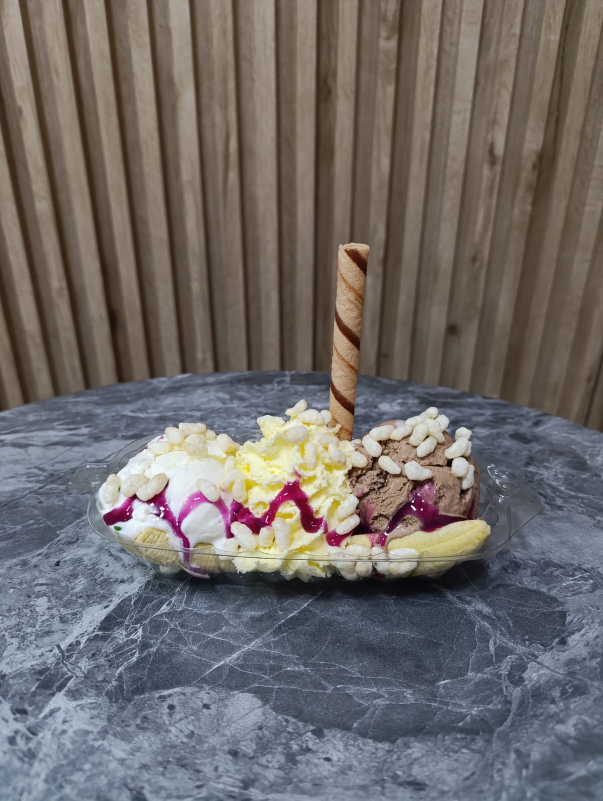Tres porciones de helado, crispy blanco, chantilly, gomitas, Salsa arequipe, Barquillos.