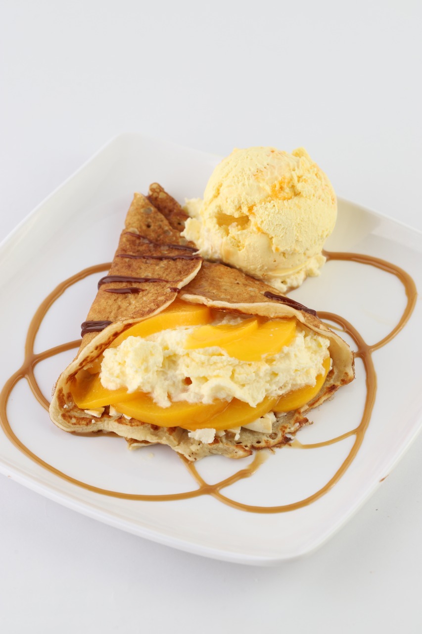 Deliciosa tortilla, una porción de fruta, un sabor de helado, crema chantillí y salsa de arequipe.