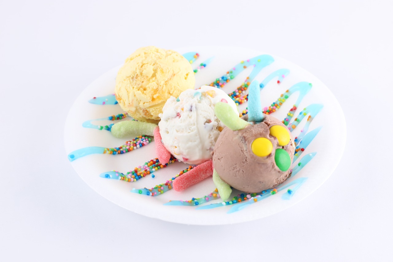 4 sabores de helado, queso, chantilly, banano, cerezas, 2 barquillos cortos y salsa a tu elección