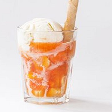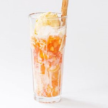 2 Sabores de helado. maracuyá en almíbar, mango, crema chantillí, decorada con fresa y abanico de galleta o 2 barquillos cortos.