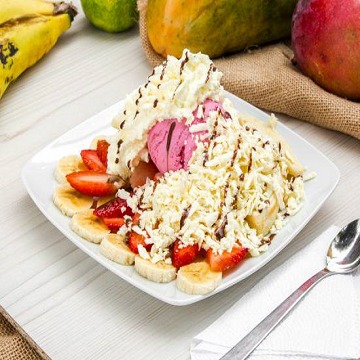 3 sabores de helado,1 banano, chantillí, 3 cerezas, barquillos Piazza y salsa a tu elección