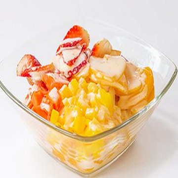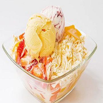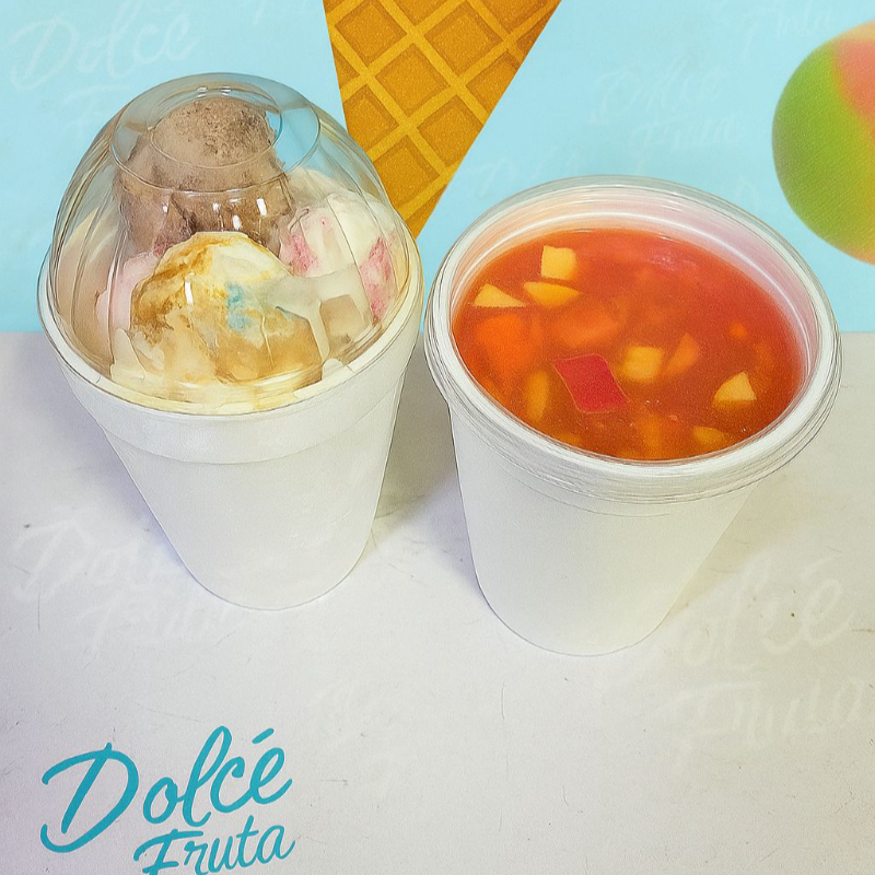 Variedad de frutas picadas, acompañada de 2 sabores de sabores de helado, queso, crema de leche o yogur.