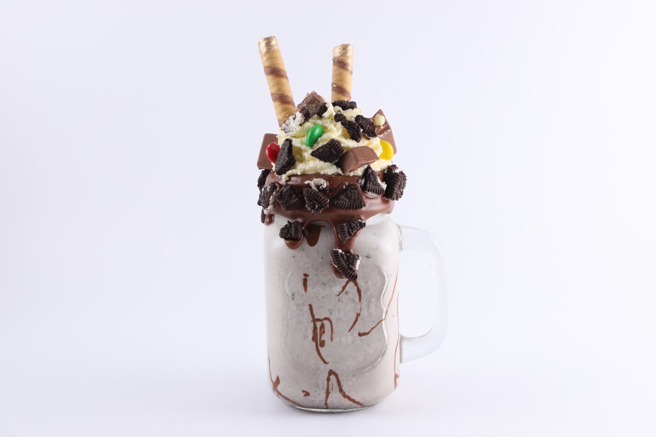 Deliciosa malteada acompañada de galleta Oreo, crema de avellanas, trozos de chocolatina jumbo, chocodisk, barquillo piazza, chantillí y salsa a tu elección
