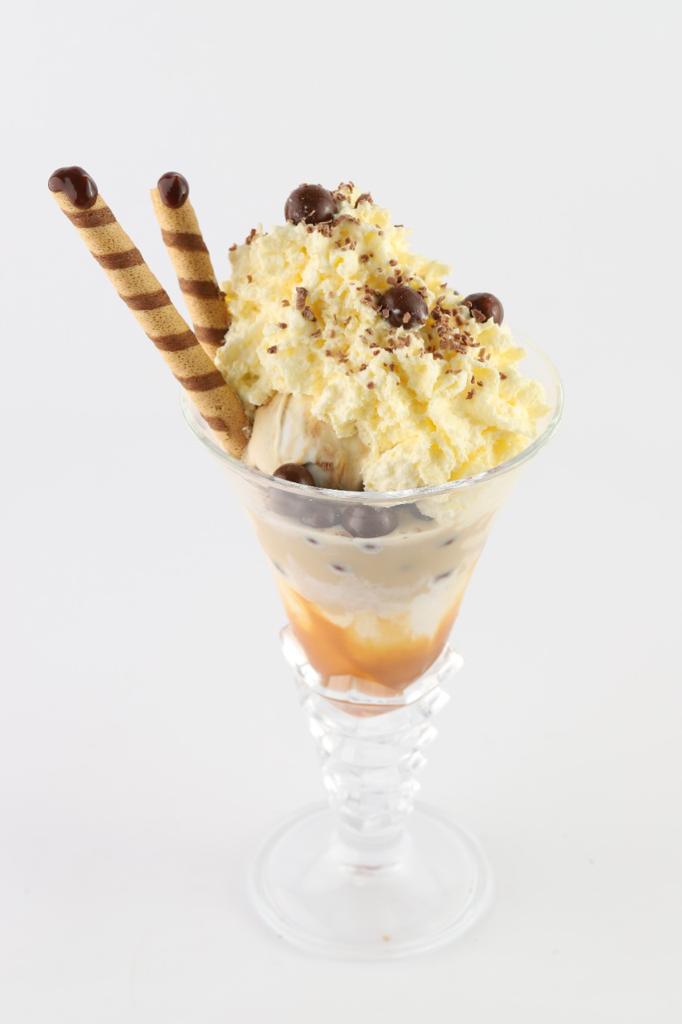2 Sabores de helado, queso, chantillí, salsa a tu elección, cereza, abanicó de galleta o barquillos cortos.
