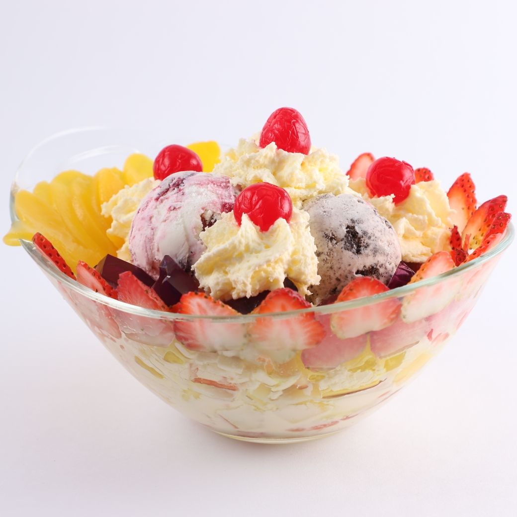 Variedad de frutas picadas acompañadas de 3 sabores de helado, gelatina, queso, chantillí, cerezas, crema de lecha y yogur