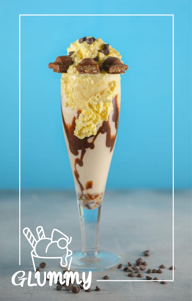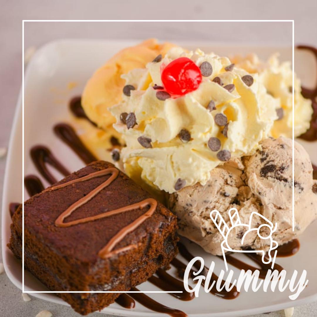 Dos bolas de helado, 1 cereza, salsa, brownie, chantillí y chips de chocolate, queso o fruta.