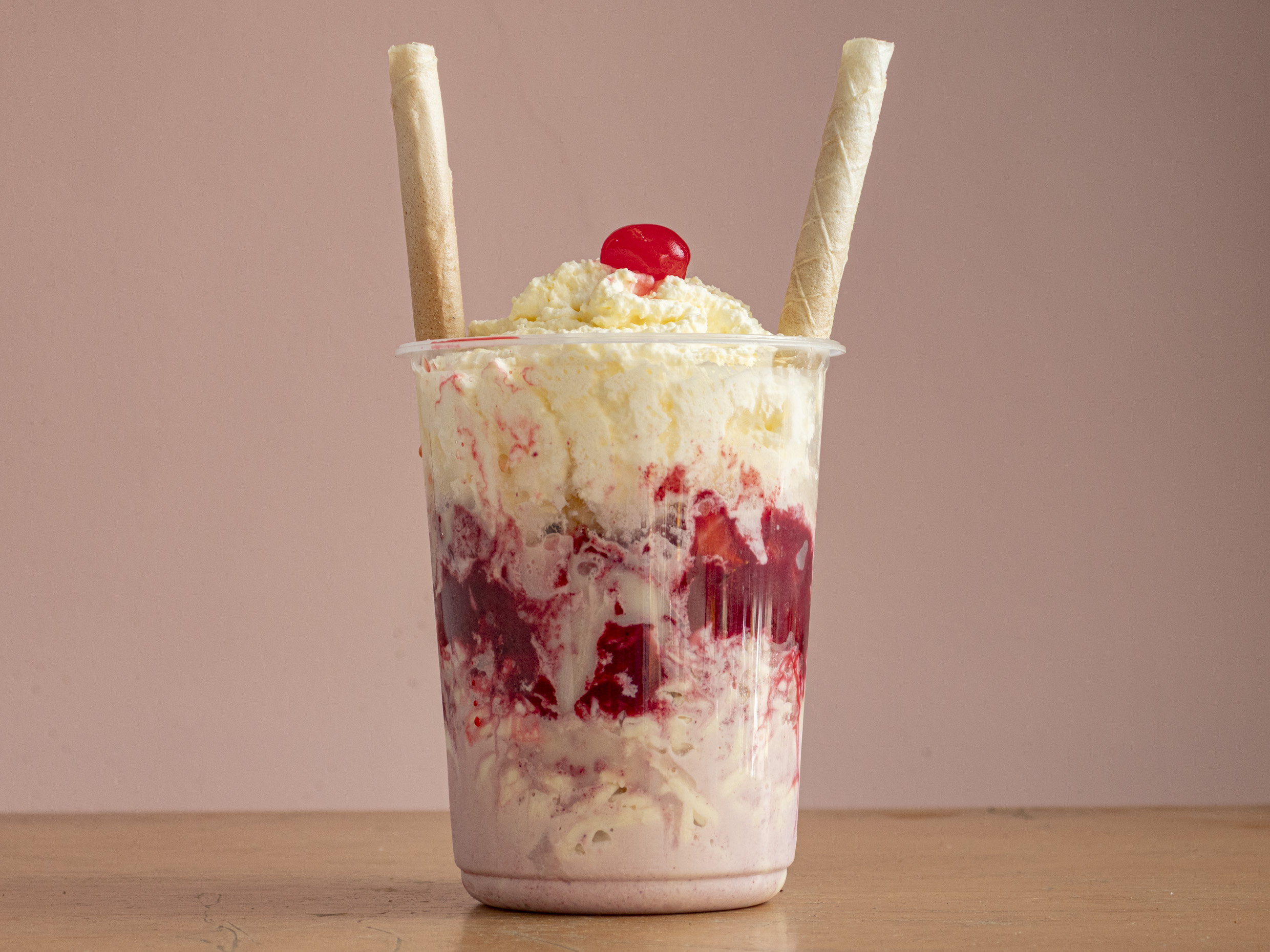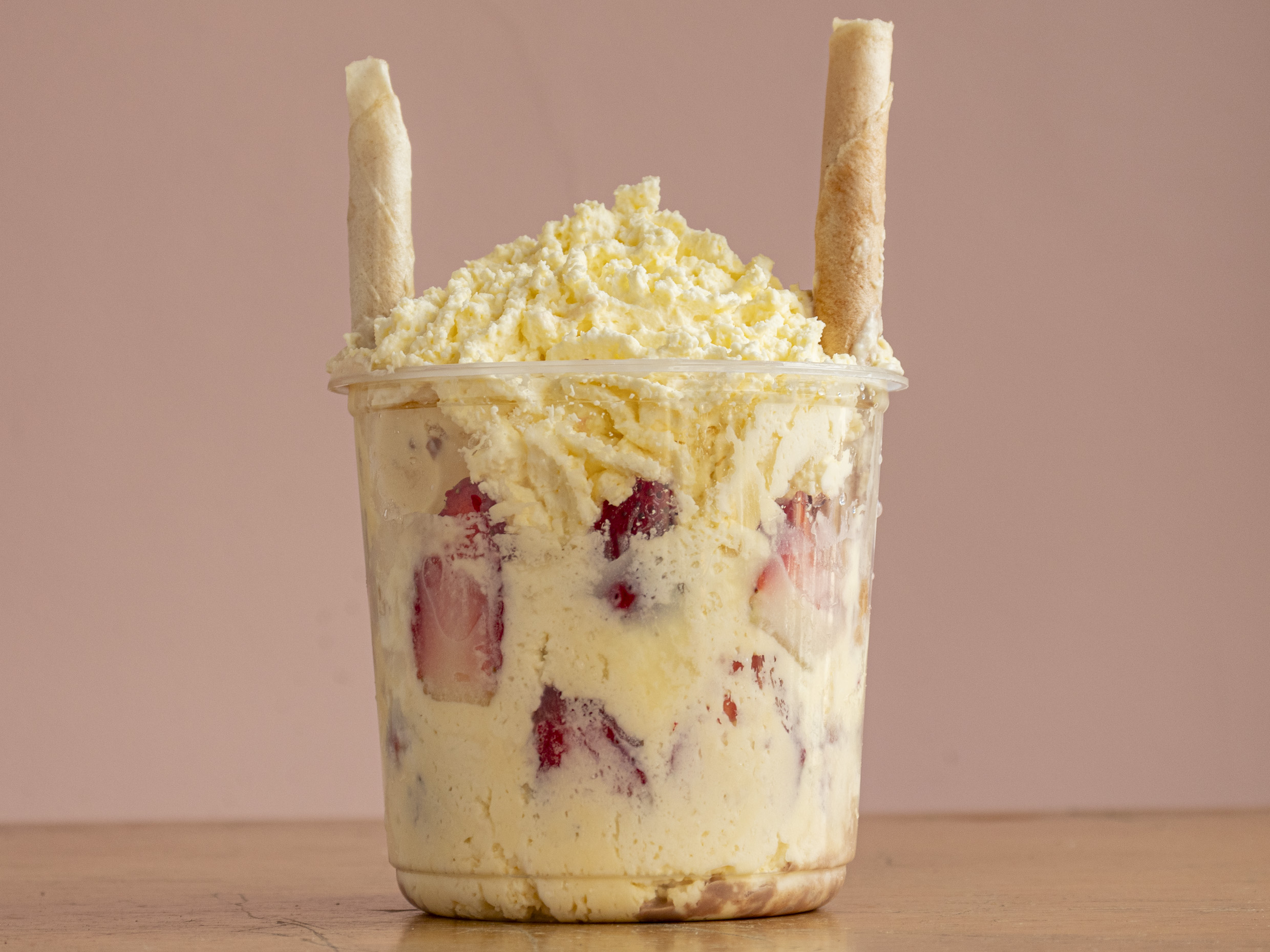 Fresa, crema de leche, lechera, doble porción de queso, dos bolas de helado y chantillí.