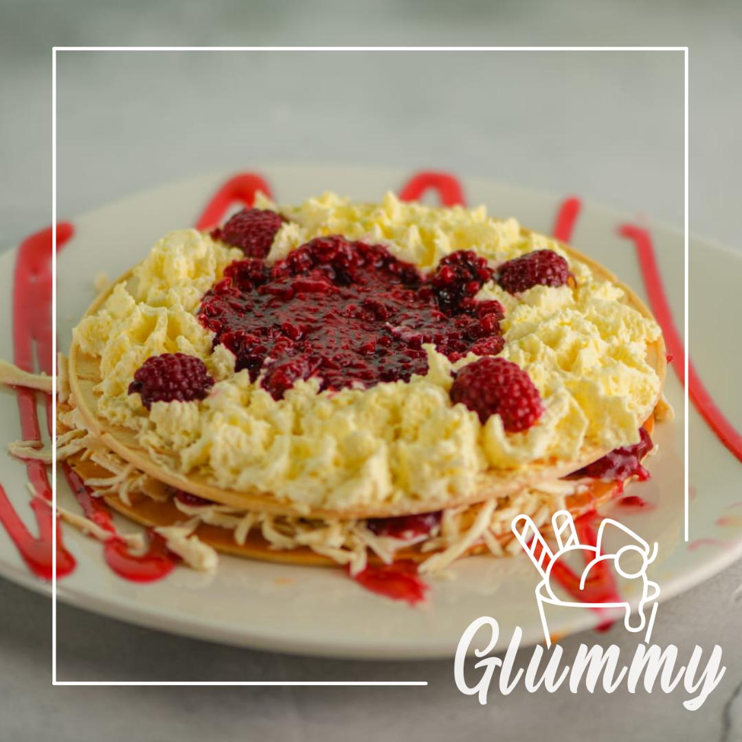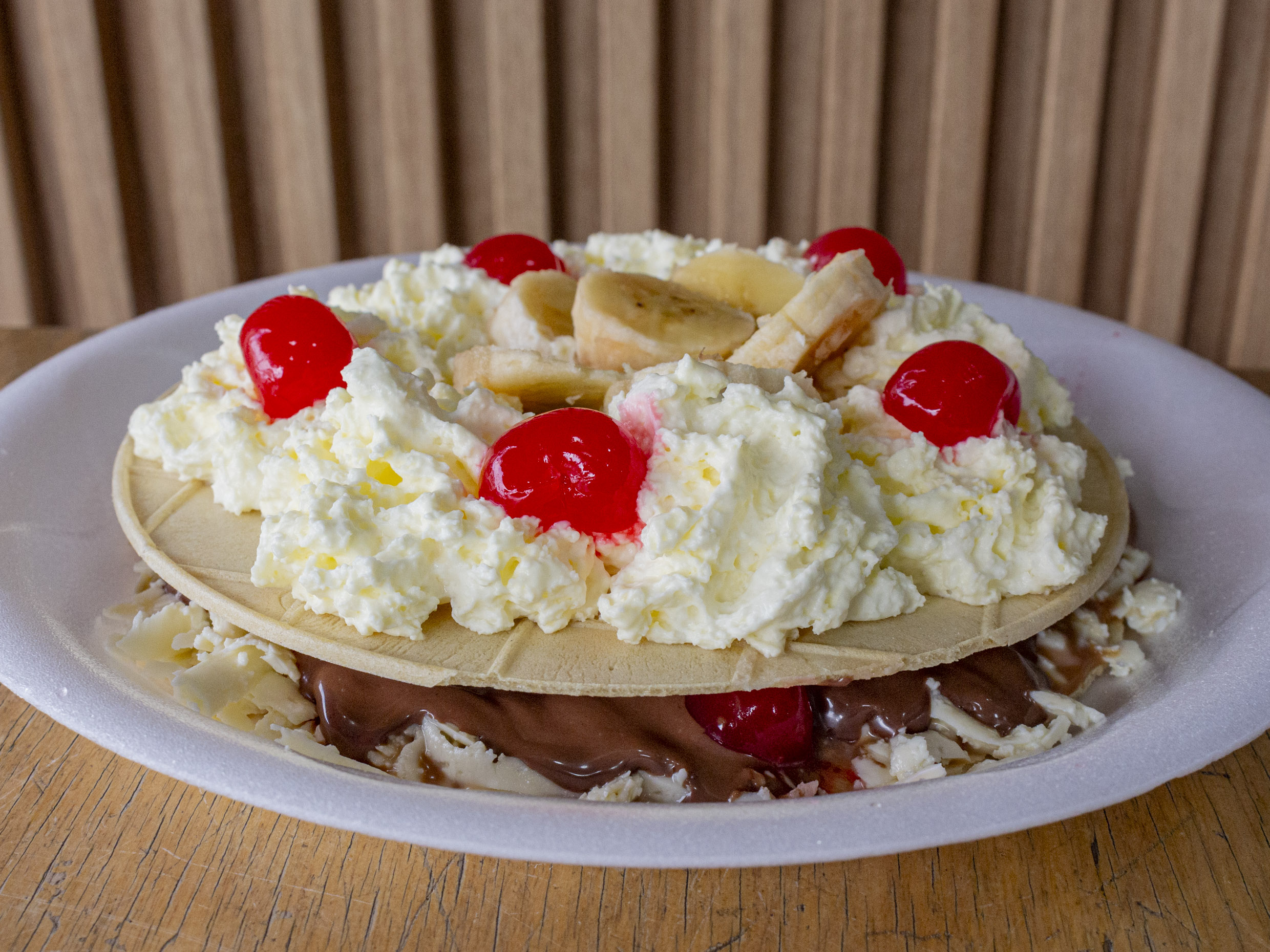 Oblea con nutella, salsa de chocolate, arequipe, chantillí, banano, cereza y queso.