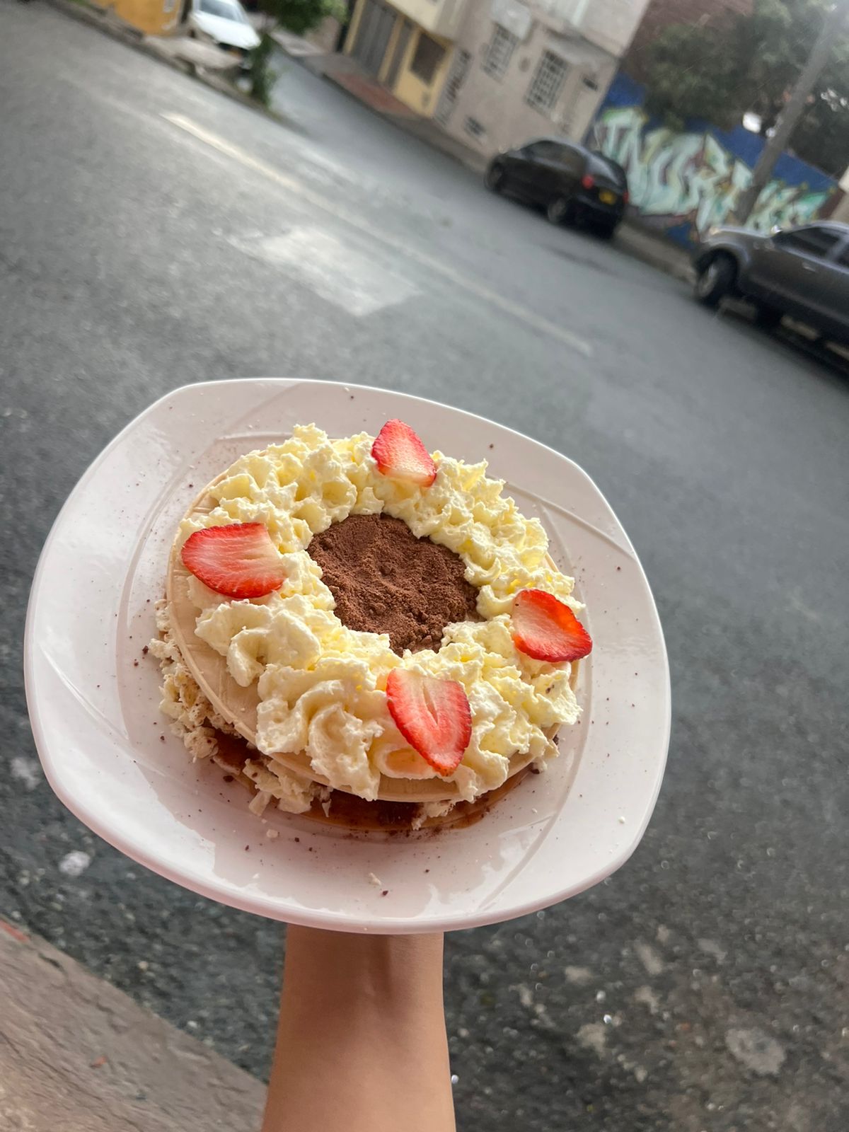 Oblea, arequipe, chantillí, fresa, milo y queso.