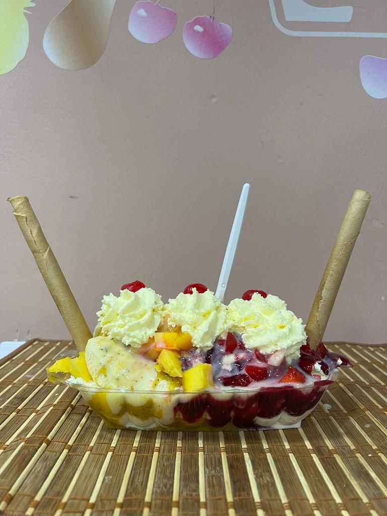 Tres bolas de helado, arroz soplado, crema de leche, lechera, chantillí barquillos, queso y dos frutas o tres frutas.