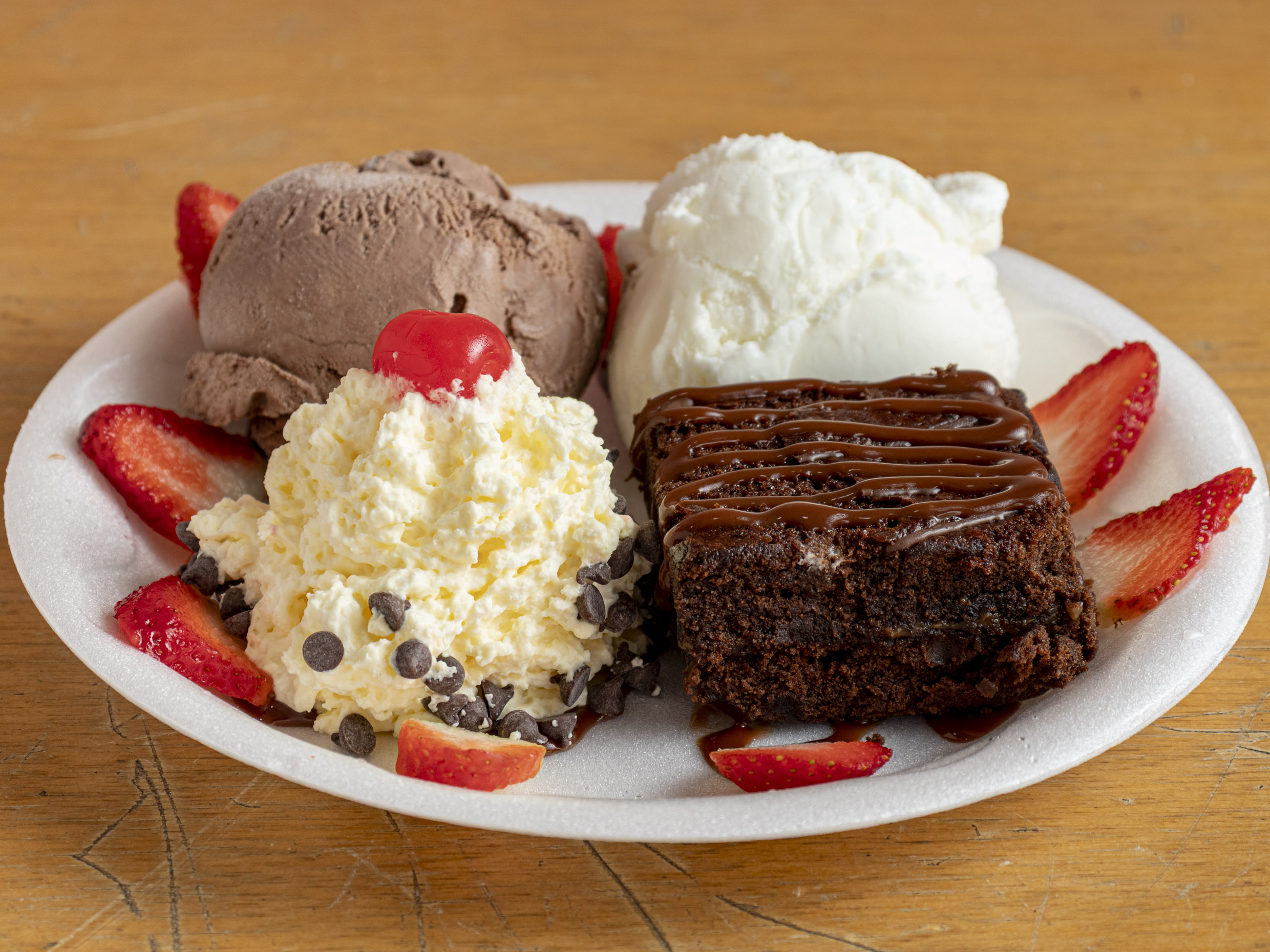 Dos bolas de helado, 1 cereza, salsa, brownie, chantillí y chips de chocolate, queso y fruta o dos frutas.