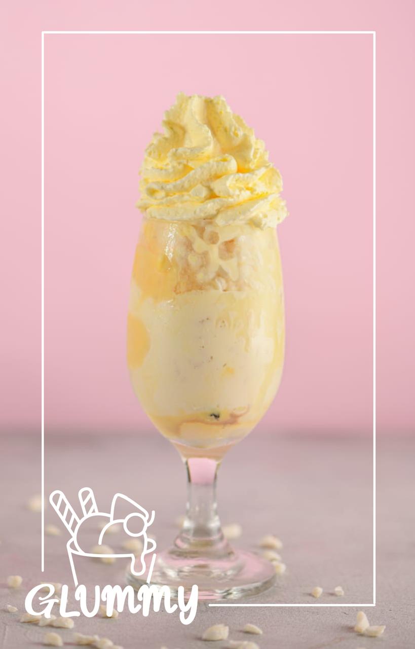 Dos bolas de helado, crema de leche, mermelada de maracuyá, trozos de fruta, lechera, queso y chantillí.