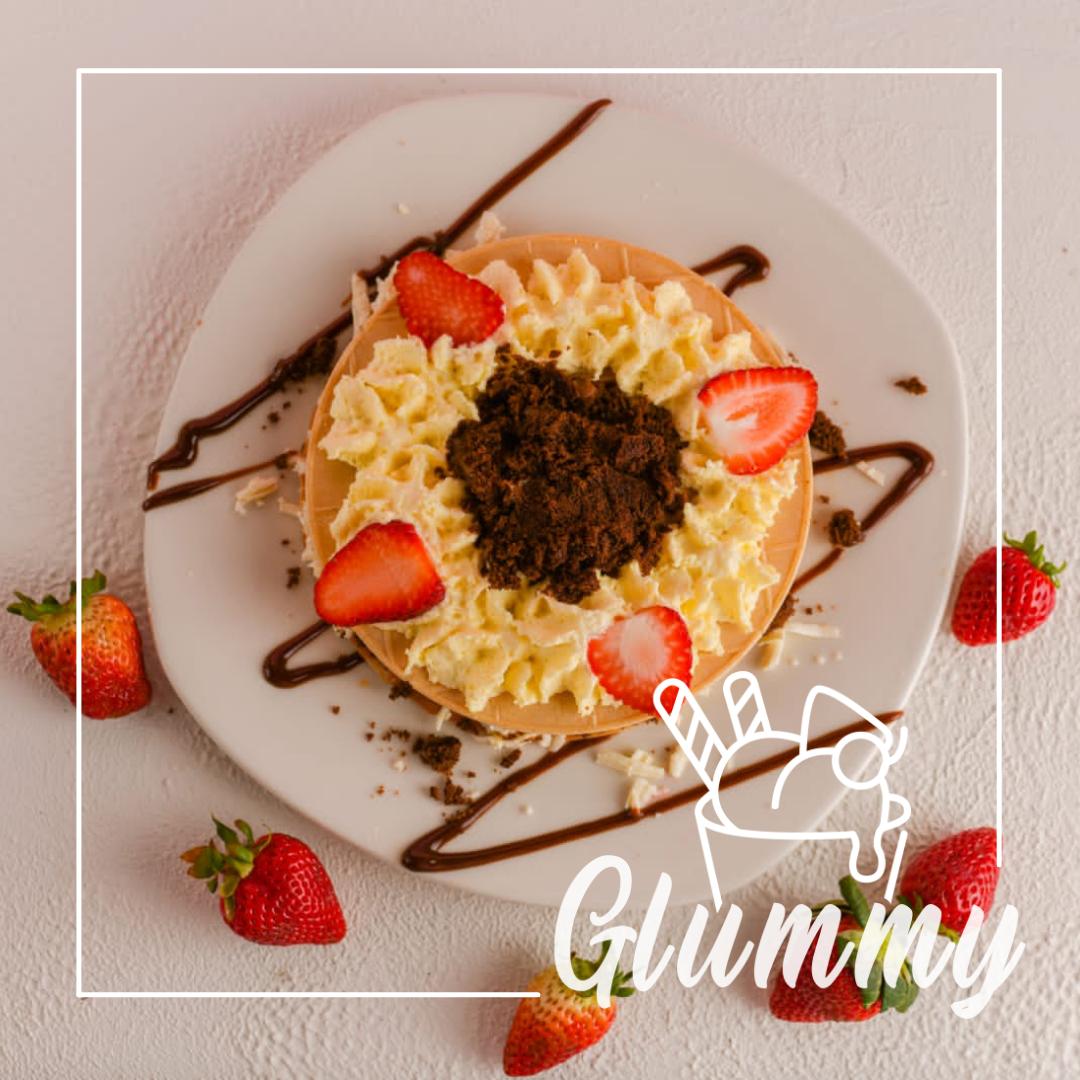 Oblea, nutella, fresas, chips de chocolate, salsa de chocolate, chantillí y queso.